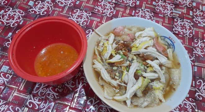 Isinya mangkuk ampe ngeluber nih gaes, ada suwiran daging ayam, irisan kol,tauge,seledri,bumbu kacang yang ditumbuk kasar plus kerupuk berbahan dasar singkong, uap soto menguar menggoda Mang Admin untuk segera icip icip,emang mantap nih soto racikan Bu Sunarti, ditambah sambal duh aduh lezatnya.